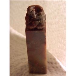 HAND CARVED MARBLE PEDESTAL - ORIENTAL RAT ON TOP - REDISH MARBLE - 2 3/4" TALL - ORIENTAL WRITING ON BASE STAMPED "W.C." WITH ORIGI...