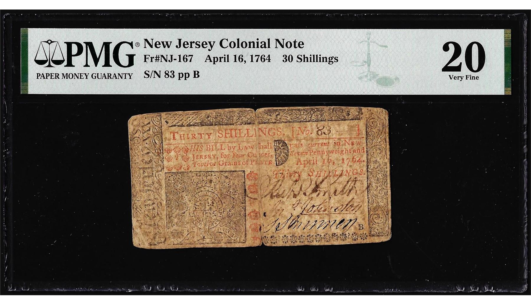 One April 16, 1764 New Jersey 30 Shilling Colonial Currency Note NJ-167 PMG Very Fine 20. PMG Certified.
