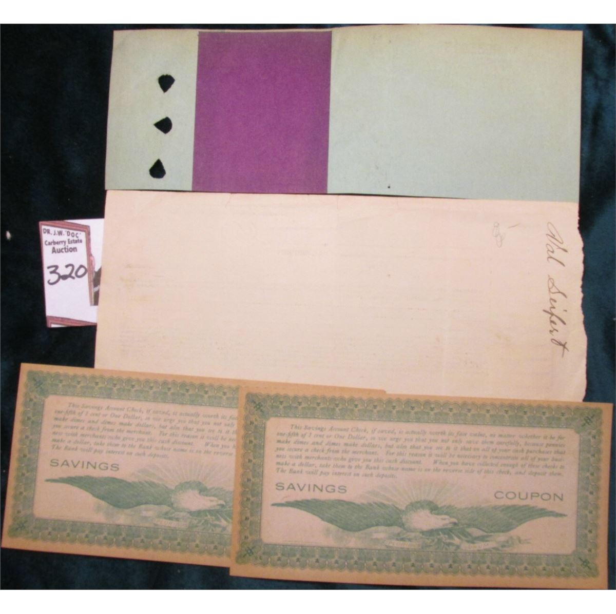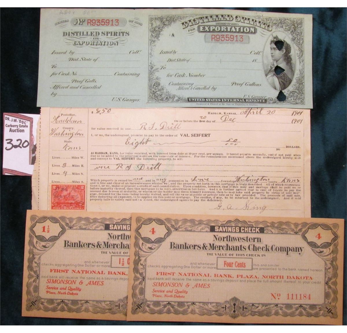 "April 20, 1901 Promissory Note with 2c Revenue Stamp from Post Office Haddam County Washington State Kansas"; & Series of 1878 "Distilled Spirits for Exportation", hole cancelled "United States Internal Revenue"; & "Savings Check Northwestern Bankers & Merchants Check Company...Four Cents(and 1 1/2 Cents)...First National Bank, Plaza, North Dakota".