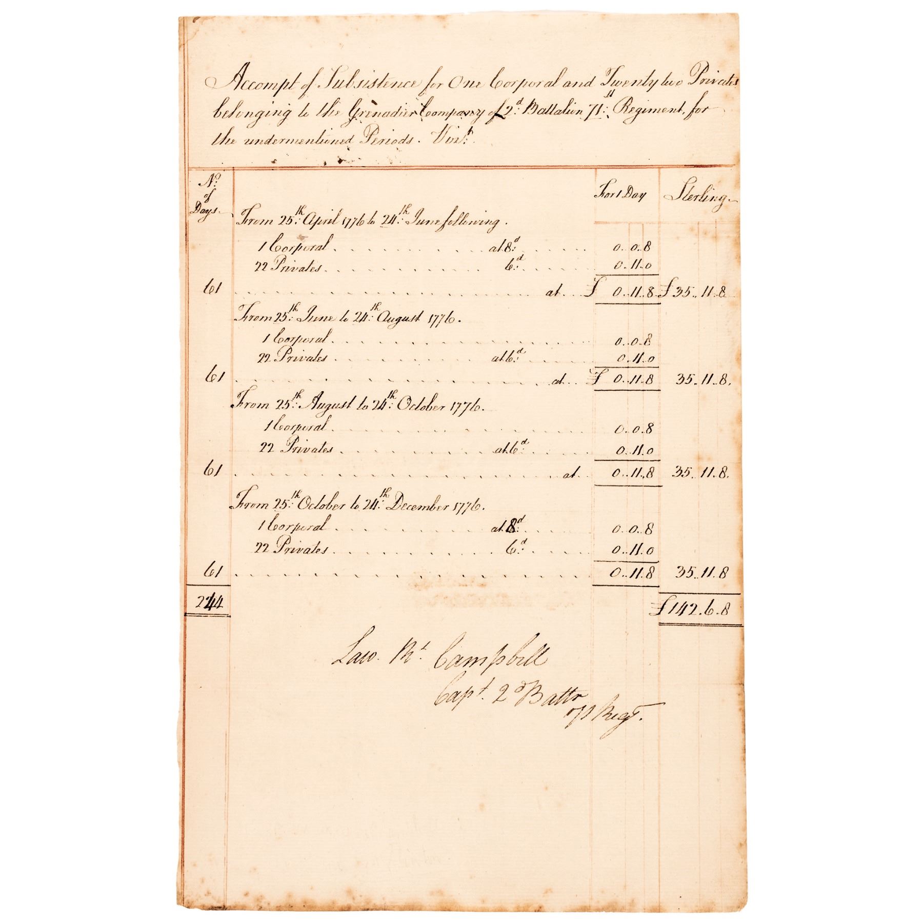 April 25th 1776 to December 1776-Dated Revolutionary War, British 71st Regiment of Foot Manuscript Document Signed, “Law(rence) R. Campbell, Capt. 2nd Batt(allion) 71st Regt.,” an “Account of Subsistence for One Corporal and Twenty-two Privates belonging to the Grenadier Company of 2nd Battalion, 71st Regiment,...” (The 71st Regiment's last American battle action was at the Siege of Yorktown in September 1781)