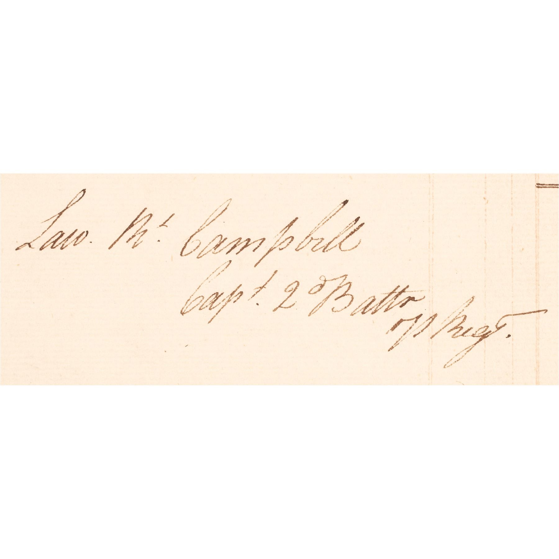 This “Account of Subsistence” payments document measures 12.5” x 8” and records them on four separate occasions to “One Corporals and 24 Privates” in the British military service. Nicely written on clean watermarked “C. TAYLOR” laid period paper, with only some minot marginal edge tone. It appears that Corporals were paid 8 Pence per day while the Privates received 6 Pence each per day. The total Subsistence expenditures recorded here were 142 Pounds, Six Shillings and 8 Pence over a period of 244 days. Signed at the bottom by Captain Law. R. Campbell of the 2nd Battalion of the 71st Regiment, with Docket noted “Captn. L. R. Campbell” on the blank reverse.