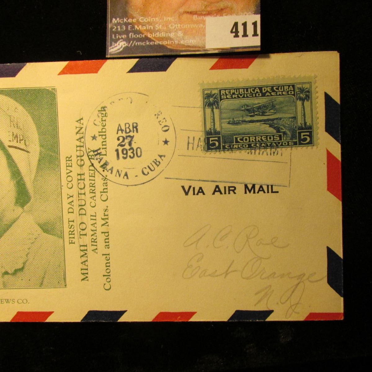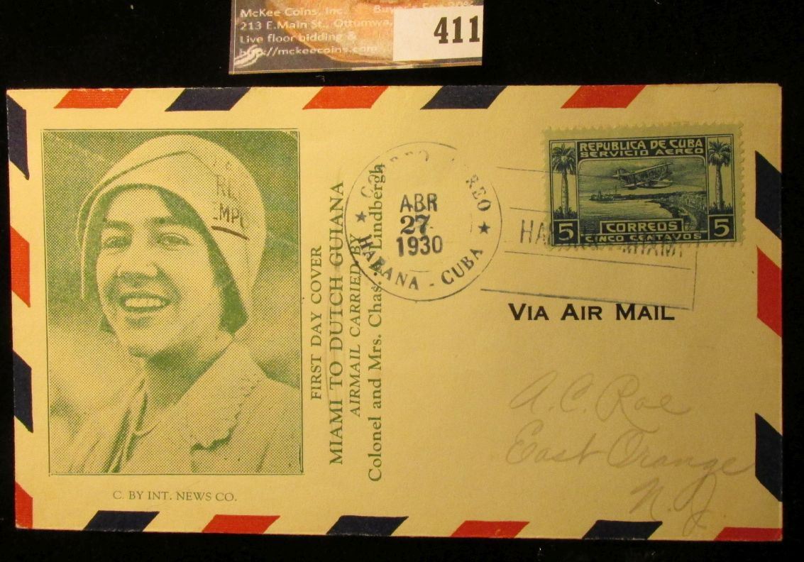 April 27, 1930 Postmarked Havana, Cuba First Day Cover "Miami to Dutch Guiana Airmail Carried by Colonel and Mrs. Charles A. Lindbergh Via Air Mail", complete with Republic of Cuba Five Centavos Stamp.