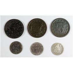 1840-O DIME AG, 1876-CC DIME VG A LITTLE DARK, ( 2 ) 1845 LARGE CENTS 1-GOOD DARK & 1-FINE DARK AND ( 1 ) 1848 GOOD DARK LARGE CENT, 1885 DIME G...