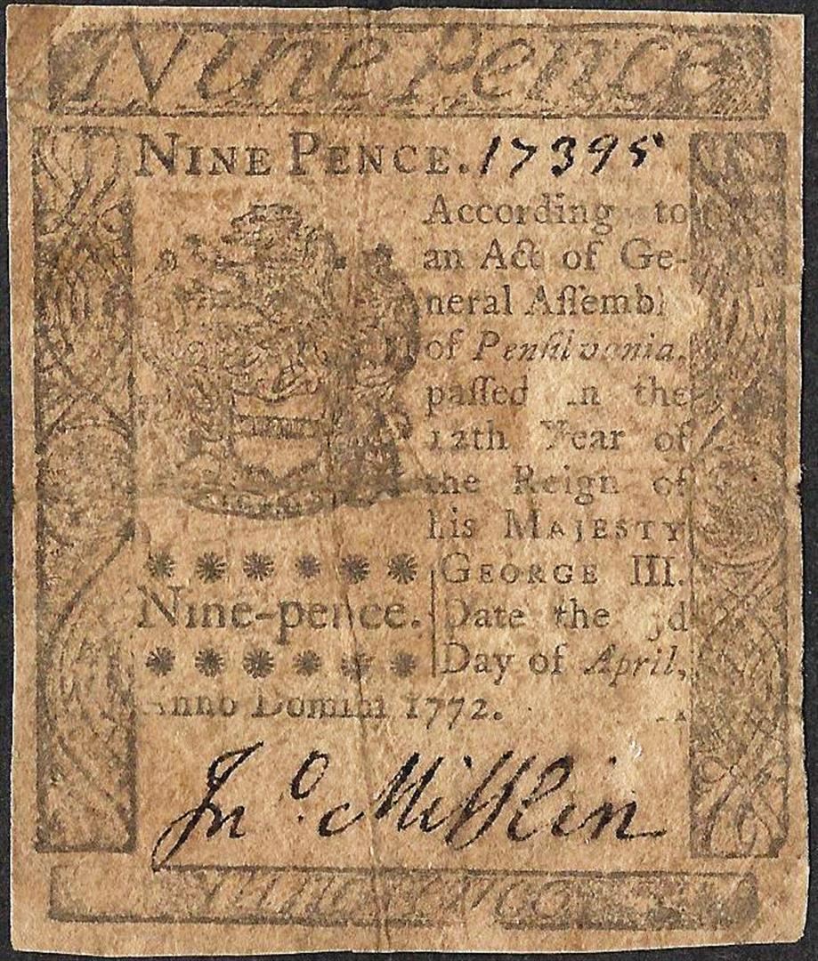 April 3, 1772 Pennsylvania Nine Pence Colonial Currency Note