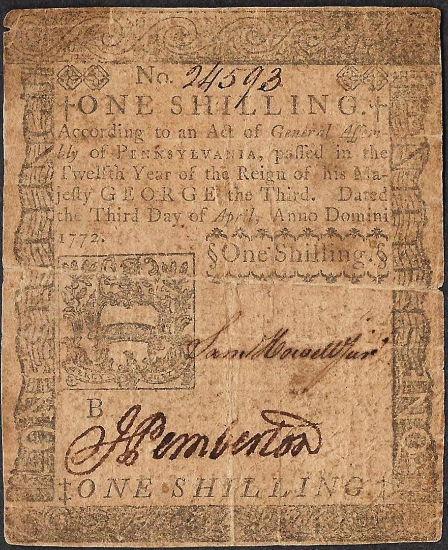 April 3, 1772 Pennsylvania One Shillings Colonial Currency Note