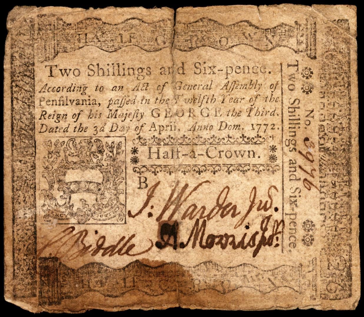 April 3, 1772 Pennsylvania Two Shillings Six Pence Colonial Currency Note