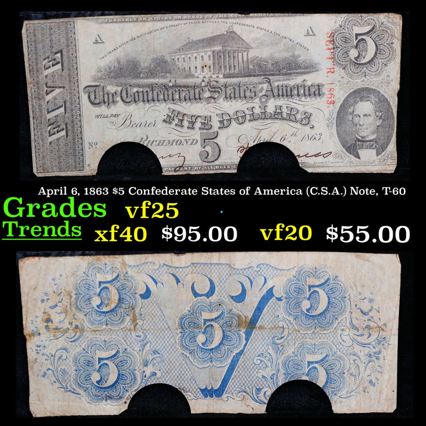 April 6, 1863 $5 Confederate States of America (C.S.A.) Note, T-60 Grades vf+