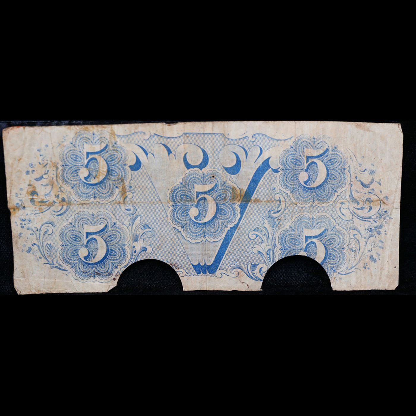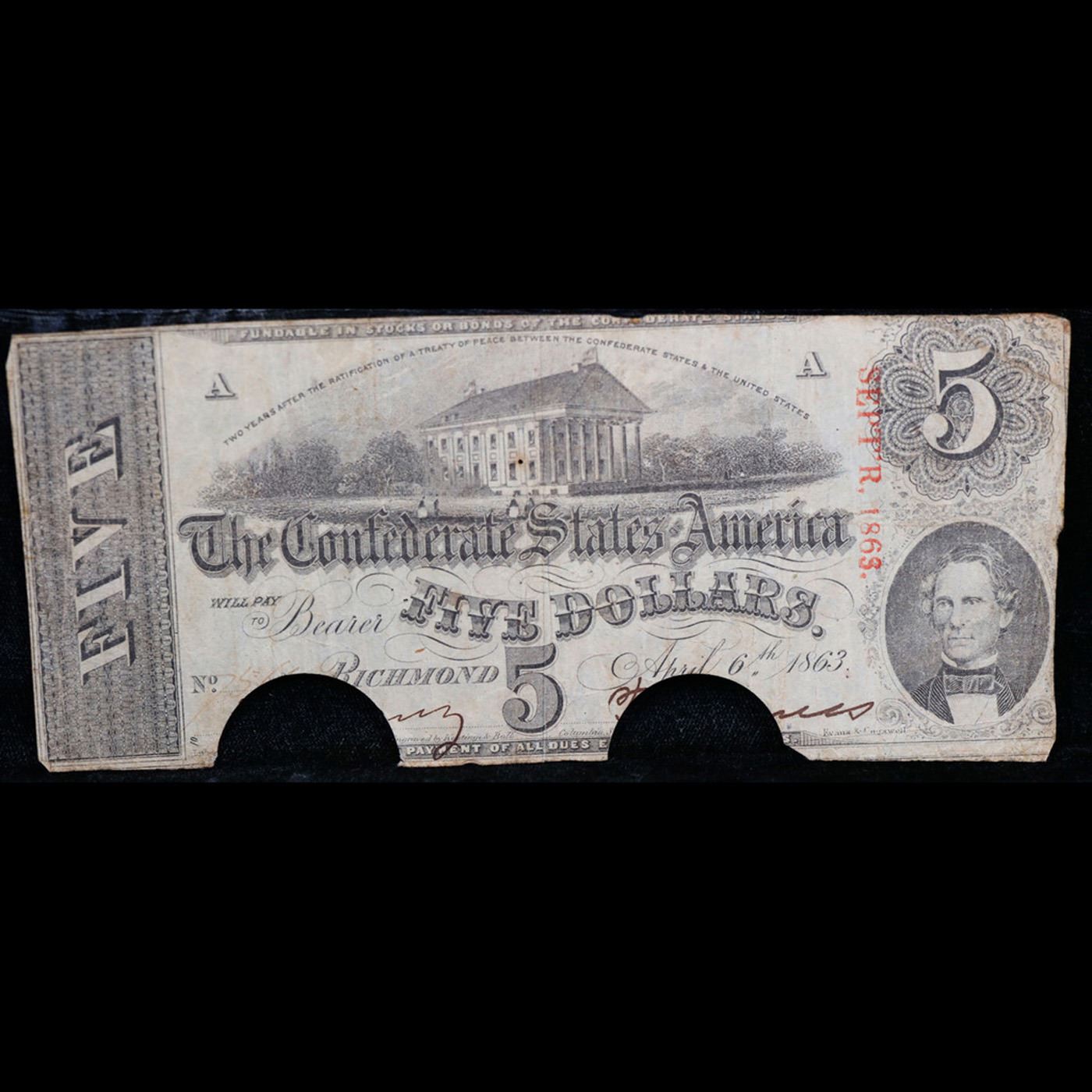 April 6, 1863 $5 Confederate States of America (C.S.A.) Note, T-60 Grades vf+.