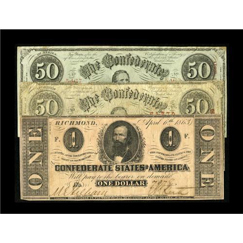 <B>April 6, 1863 Issues.</B></I><BR><B>T57 $50 (2) Good-VG, HOC; XF-AU, once mounted</B></I><BR><B>T62 $1 Fine.</B></I><BR><BR><I>From The George P. Hammerly Collection</B></I><BR><BR><b>Shipping:</b> Coin/Currency (<a target="_blank" href="http://www.heritageauctions.com/common/shipping.php">view shipping information</a>)