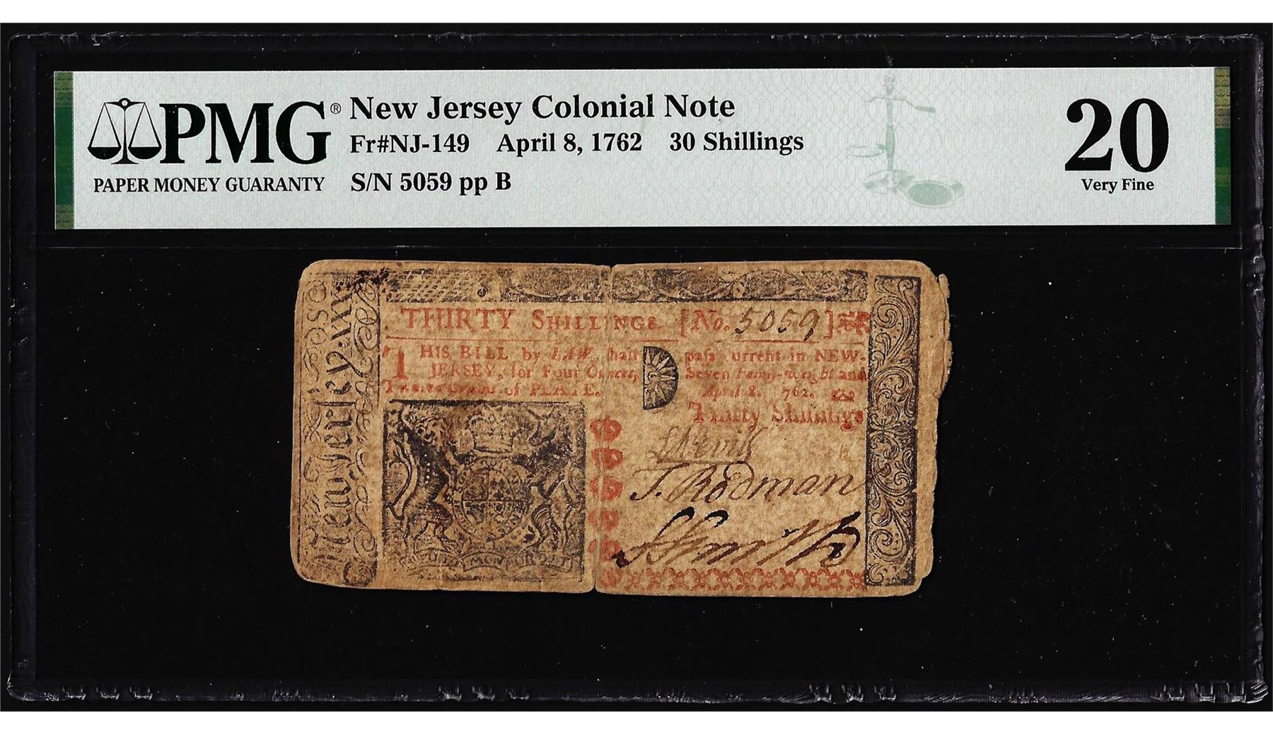 One April 8, 1762 New Jersey 30 Shilling Colonial Currency Note NJ-149 PMG Very Fine 20. PMG Certified.
