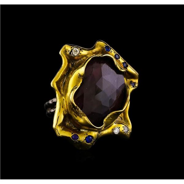 One of a kind high fashion sterling silver Ring weighing 14.9 grams. Black Antique texture. Containing: Ruby, White Crystal, Blue Crystal. This sterli