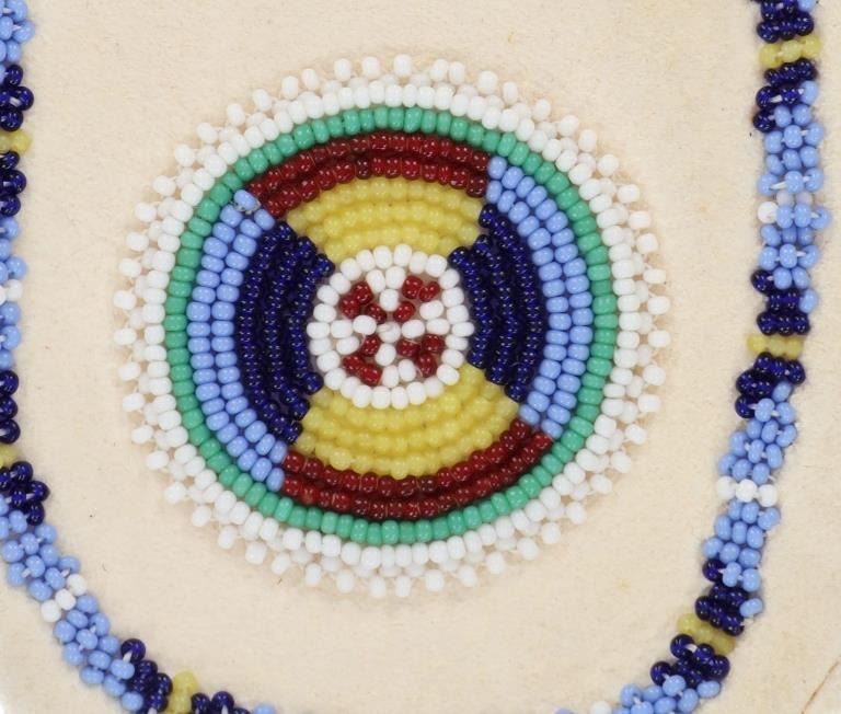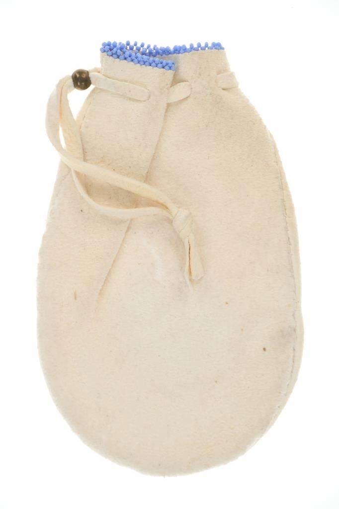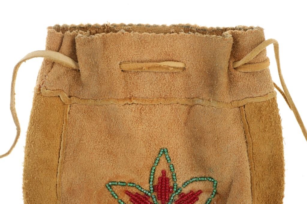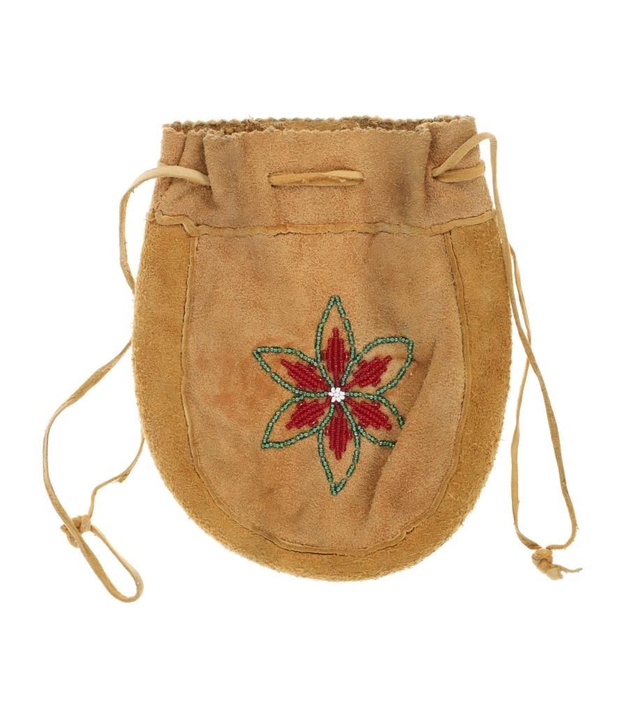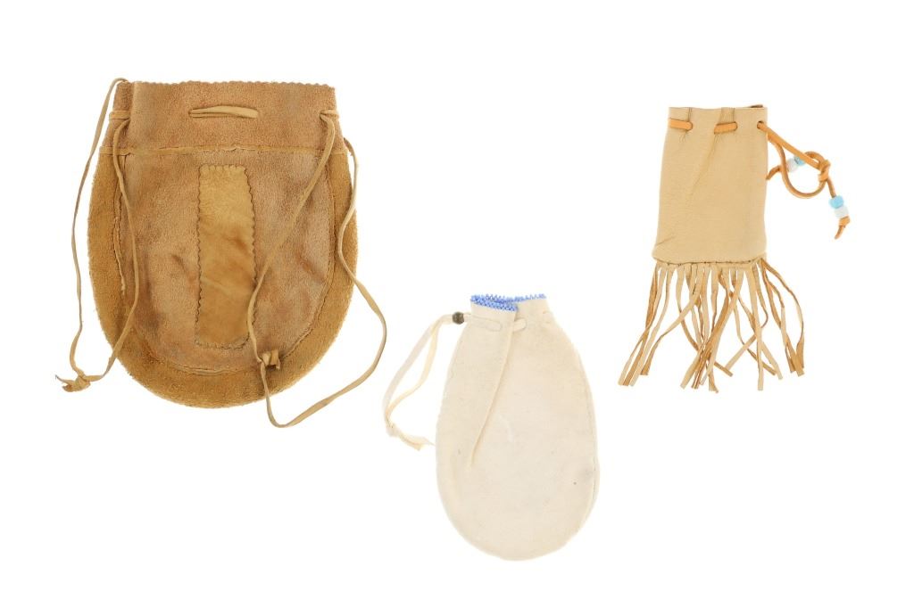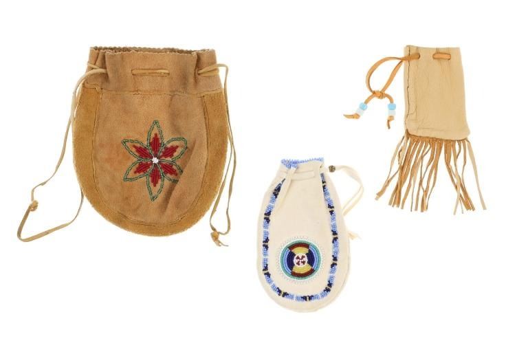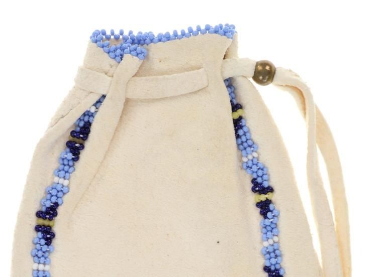 Featured in this lot is this Apsáalooke Crow hide beaded pouches circa 1960's. There are three pouches in this collection. The first is a white hide pouch with beaded decoration with trade seed beads with coloration of sky blue, black, yellow, brown, green, and chalk white. The second is a smaller pouch with two ceramic beads sky blue and white with a fringe at the bottom. The last pouch is the largest with brown colored hide with a drawstring and trade seed beads that include coloration of reflective green, translucent red, and chalk white. The condition of this collection of pouches is good with no obvious signs of damage and shows good overall condition. The measurements of these pouches range from 7" x 6" to 6 1/4" x 2 1/2". The collective weight of these pouches is U6oz.