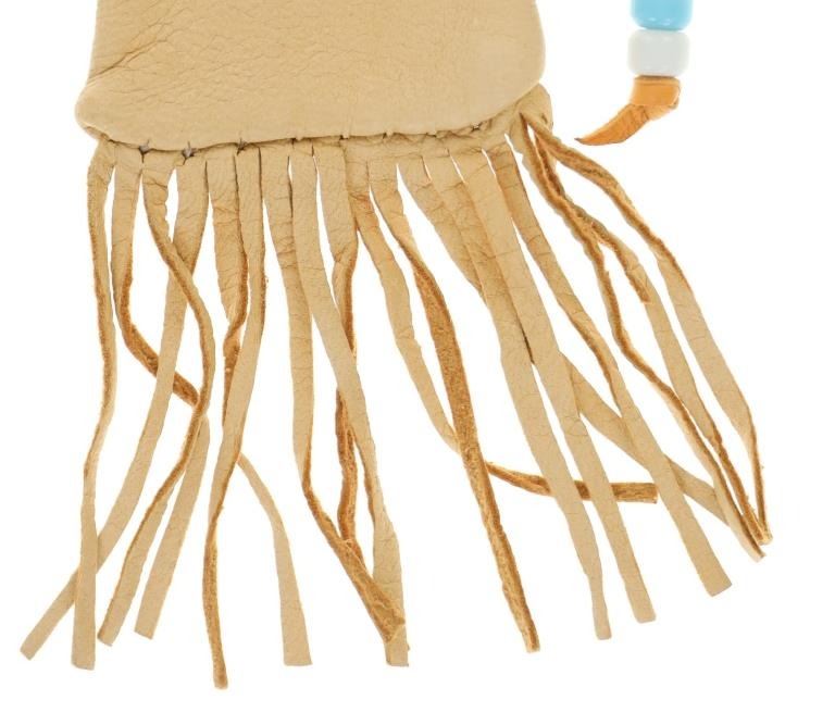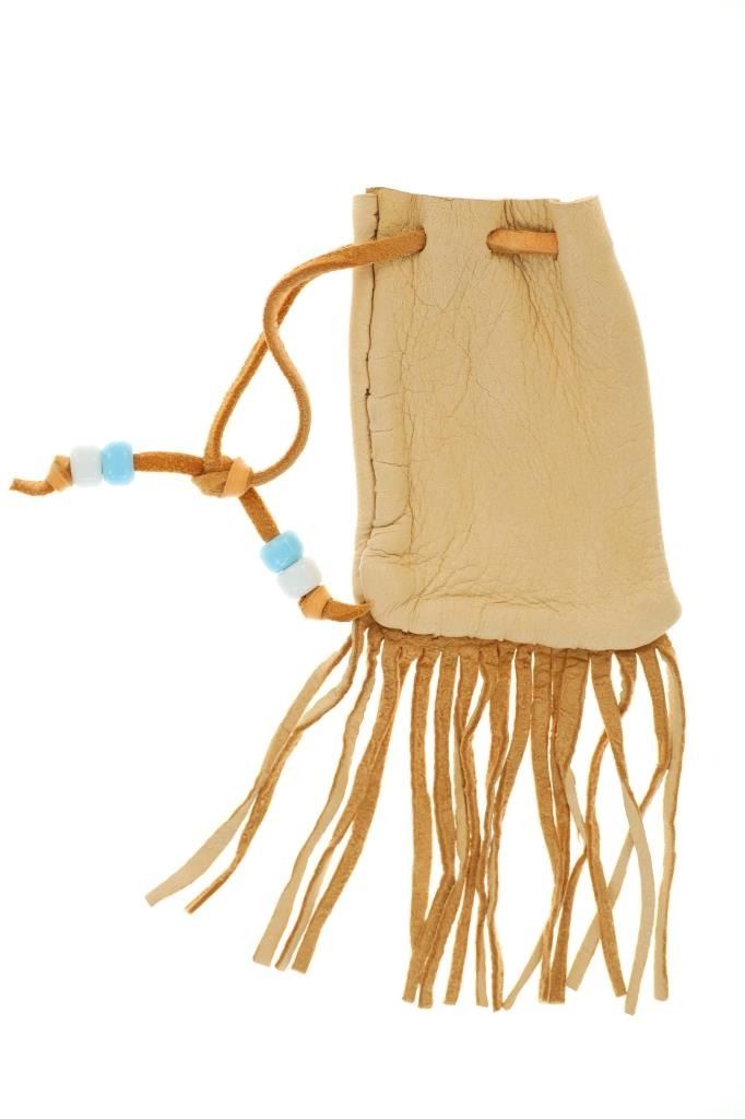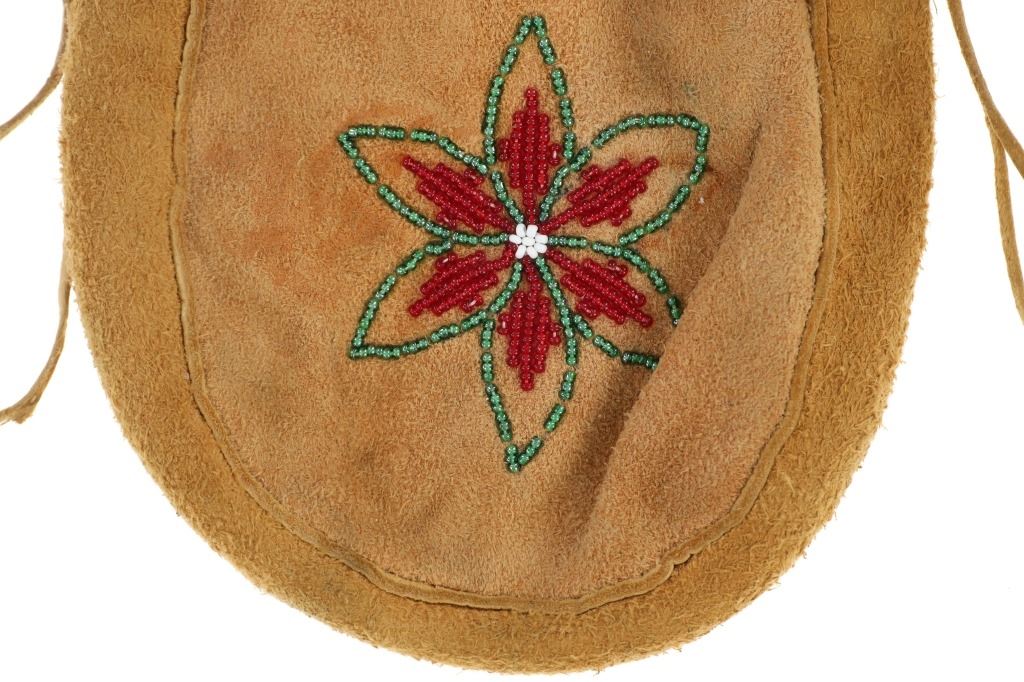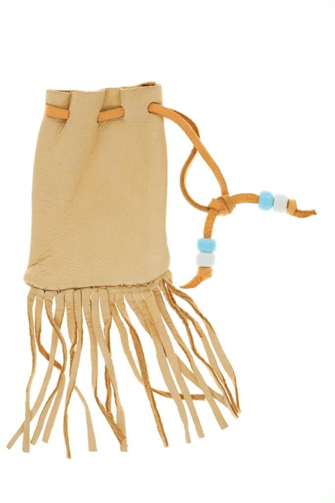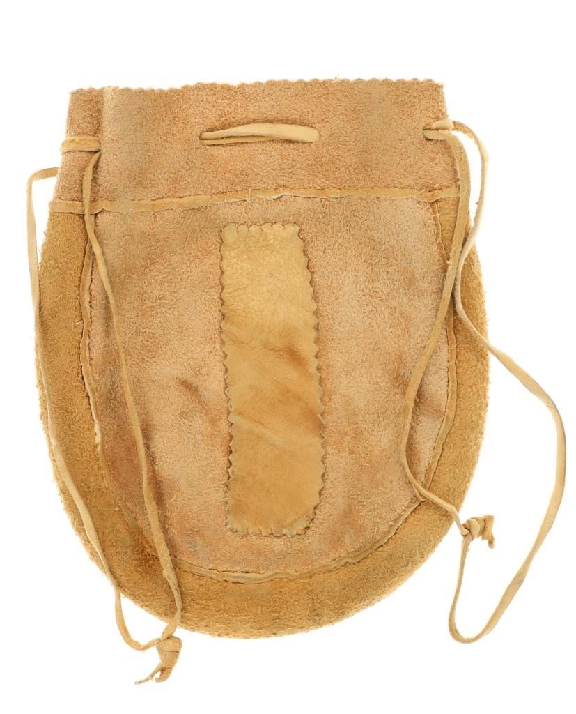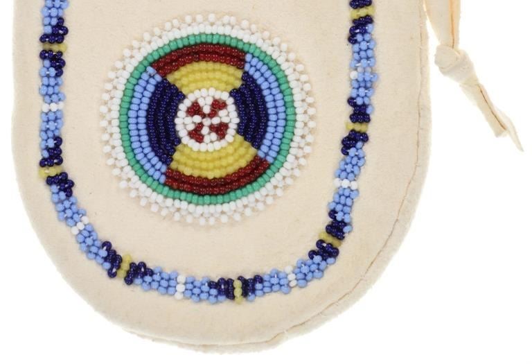 Featured in this lot is this Apsáalooke Crow hide beaded pouches circa 1960's. There are three pouches in this collection. The first is a white hide pouch with beaded decoration with trade seed beads with coloration of sky blue, black, yellow, brown, green, and chalk white. The second is a smaller pouch with two ceramic beads sky blue and white with a fringe at the bottom. The last pouch is the largest with brown colored hide with a drawstring and trade seed beads that include coloration of reflective green, translucent red, and chalk white. The condition of this collection of pouches is good with no obvious signs of damage and shows good overall condition. The measurements of these pouches range from 7" x 6" to 6 1/4" x 2 1/2". The collective weight of these pouches is U6oz.