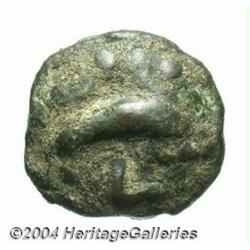 Apulia, Luceria(?). Ca. 220 B.C. AE aes grave teruncius (28 mm, 31.53 g). Star of eight rays / Dolphin right; L below, three pellets above. Rutter, HN -, but cf. 672; Thurlow-Vecchi 283; Haeberlin pl. 71, 21-3. Near VF, brown patina, encrustation. Important notice: Heritage usually auctions material at the rate of 200-250 lots per hour. On some occasions eBay Live bid software or the Internet may not be able to keep up with the pace of the auction. We recommend placing a realistic absentee bid now as insurance to avoid disappointment. Occasionally the auctioneer may eliminate or reject an eBay Live bid, and the auctioneer may also reopen a lot after the close of the eBay live bidding (usually because we missed an audience bid), and may reject your bid even if it shows you as the winning bidder. By bidding via eBay Live, you agree that Heritage may award the lot to another bidder at its sole discretion under the circumstances described above or any other reasonable circumstances. Also please note that all Heritage lots purchased through eBay Live carry a 20% Buyer's Premium. Please make sure you read the Terms and Conditions before you bid.
