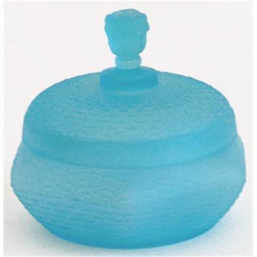 </font></strong>The lid and base of this lovely aqua blue frosted glass powder jar have an intricate basket weave design. The finial is a raised rounded rose figural. The jar has a hexagonal shape and the lid is round. This unusual blue frosted Depression Glass powder jar, with its lid, measures about 4" tall x 4" in diameter and both are in excellent condition. </font>