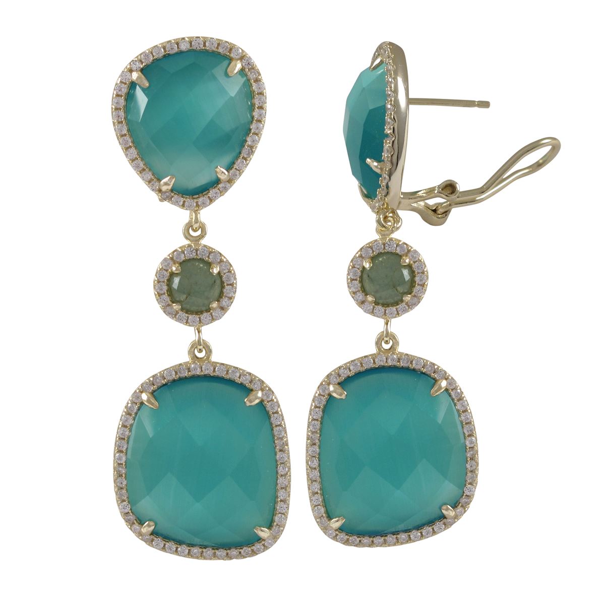Aqua Cat's Eye And Green Jade Semi Precious Stone, Set In Gold Plated Sterling Silver With CZ Border, Post Clip Earrings, 2.32