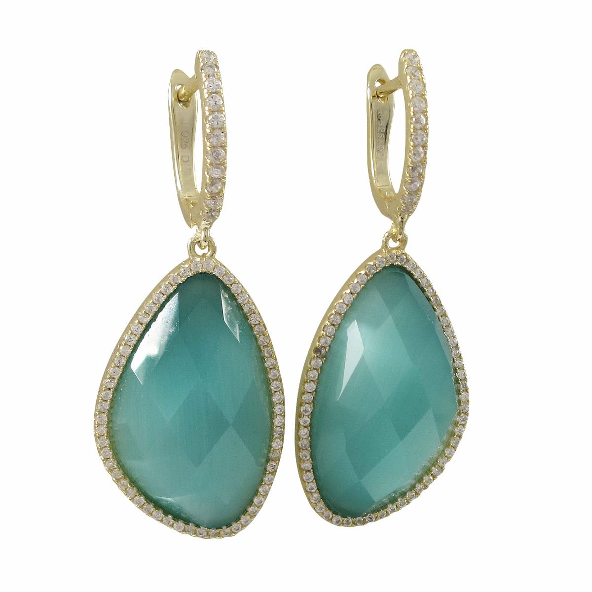 Aqua Cat's Eye Semi Precious Faceted Stone, With CZ Border, On Gold Plated Sterling Silver Lever Back Earrings, 1.77&Quot;
