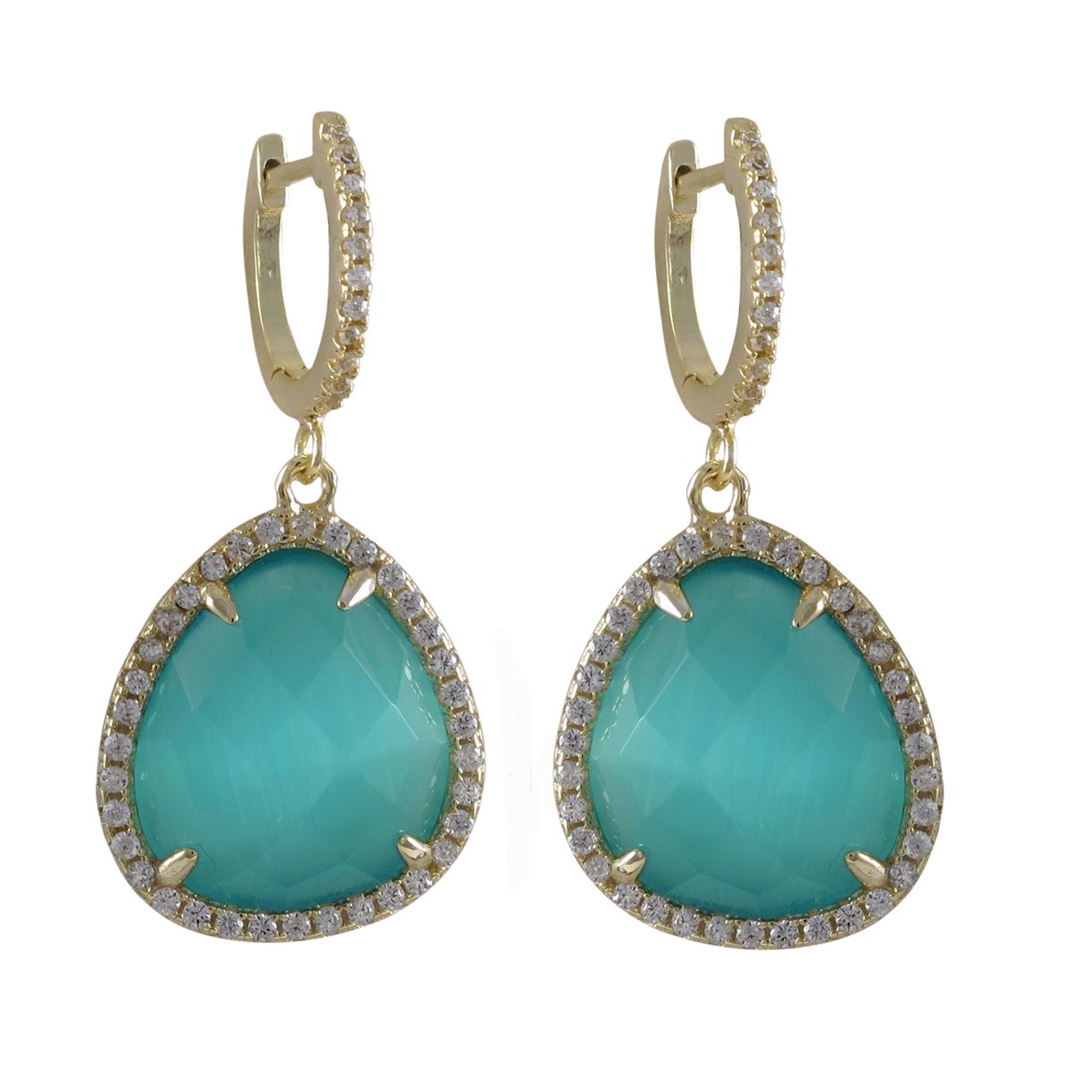 Aqua Cat's Eye Semi Precious Stone, With CZ Border, On Gold Plated Sterling Silver Lever Back Earri