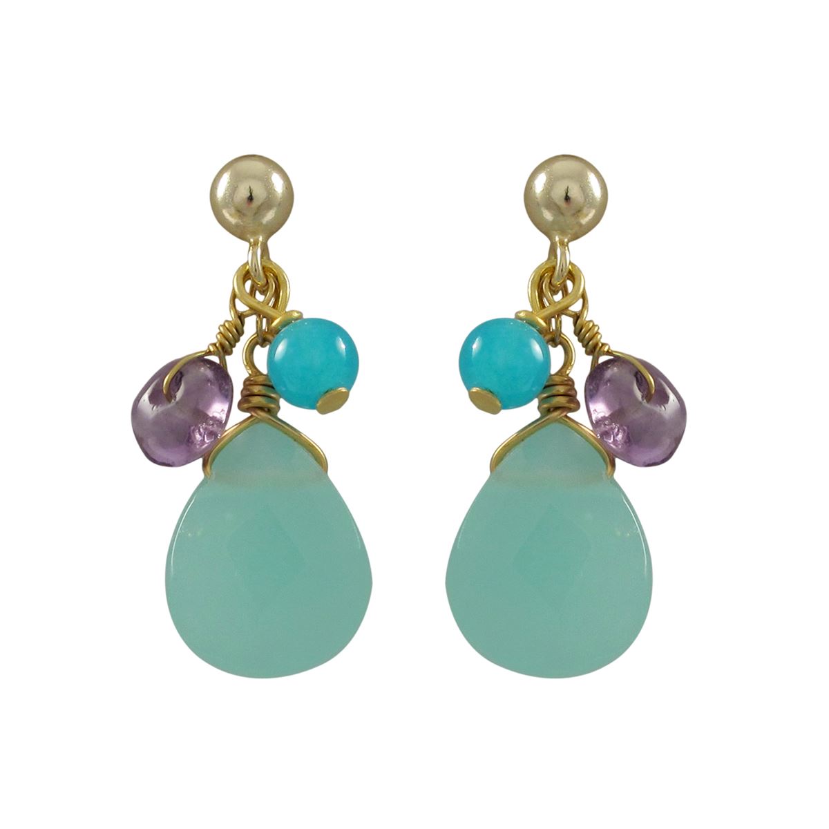 Aqua Chalcedony Combination Semi Precious Stones On Gold Plated Sterling Silver Post Earrings-0.87"