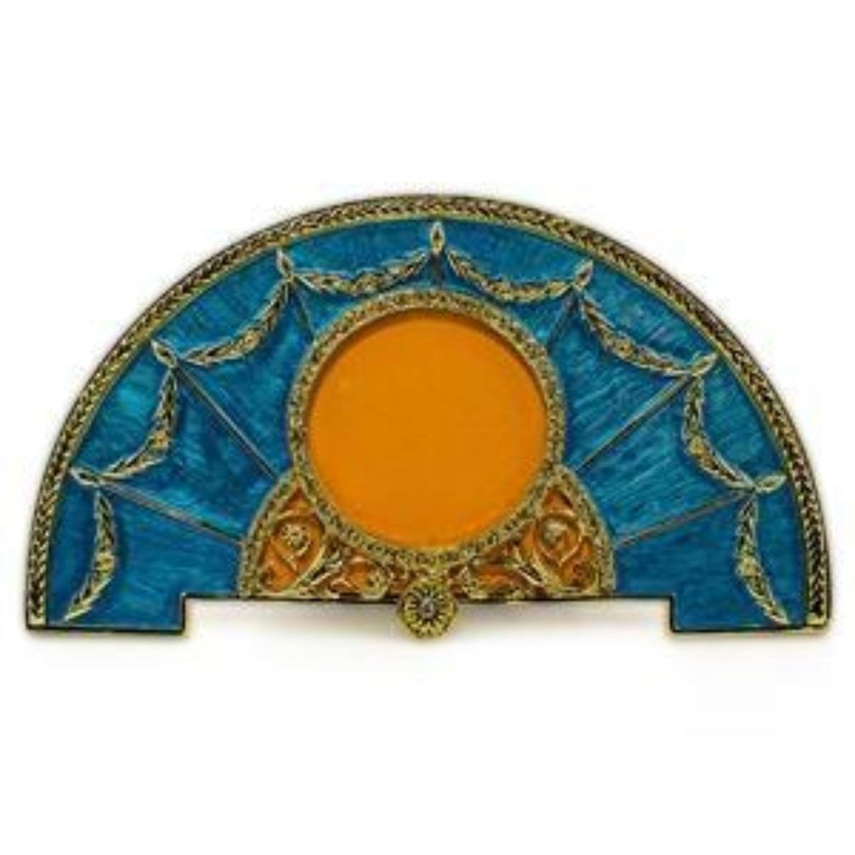 Aqua Enameled Semicircular Russian Royal Picture Frame Features:Dimensions: 6.5'' (D)Photo Opening Dimensions: 1.75" (D)Pewter, Enamel, Crystals Gift Boxed The picture frame is in two colors enamel surrounded by a crystal set ribbon tie suspended by a laurel garland. The frame's edges are covered with laurel border. Note: Romanov photograph is not included