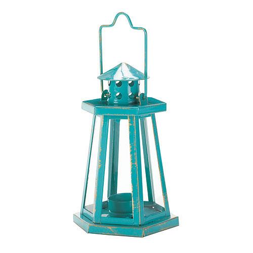 Aqua Lighthouse Mini Lantern **|**|** What could be more perfect than a pretty lighthouse lantern finished in aquamarine blue? This charming lighting accent is ready for the candle of your choice, and you can hang it up or set it on your tabletop.Description Details Item weight: 1 lb.Product Dimensions: 5-1/4 x 4-1/2" x 8-1/4" high; 10-1/2" high with handle on top.Product Material: Iron and glass.UPC Code: 849179021726.Packaging: 1 EA"