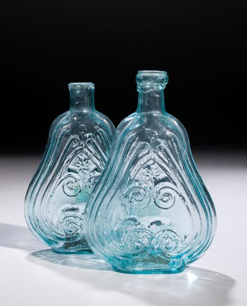 ca 1852-64, both GIX-10, two scroll flasks attributed to either the Ravenna, Ohio, or Louisville Glass Works, one with sheared lip, both have iron pontils; 7" high; the other with an applied lip, 7.5" high.