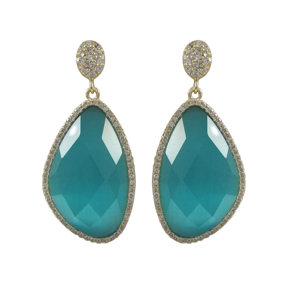 Aqua Semi Precious Stone On Gold Plated Sterling Silver CZ Post Earrings, 1.5"