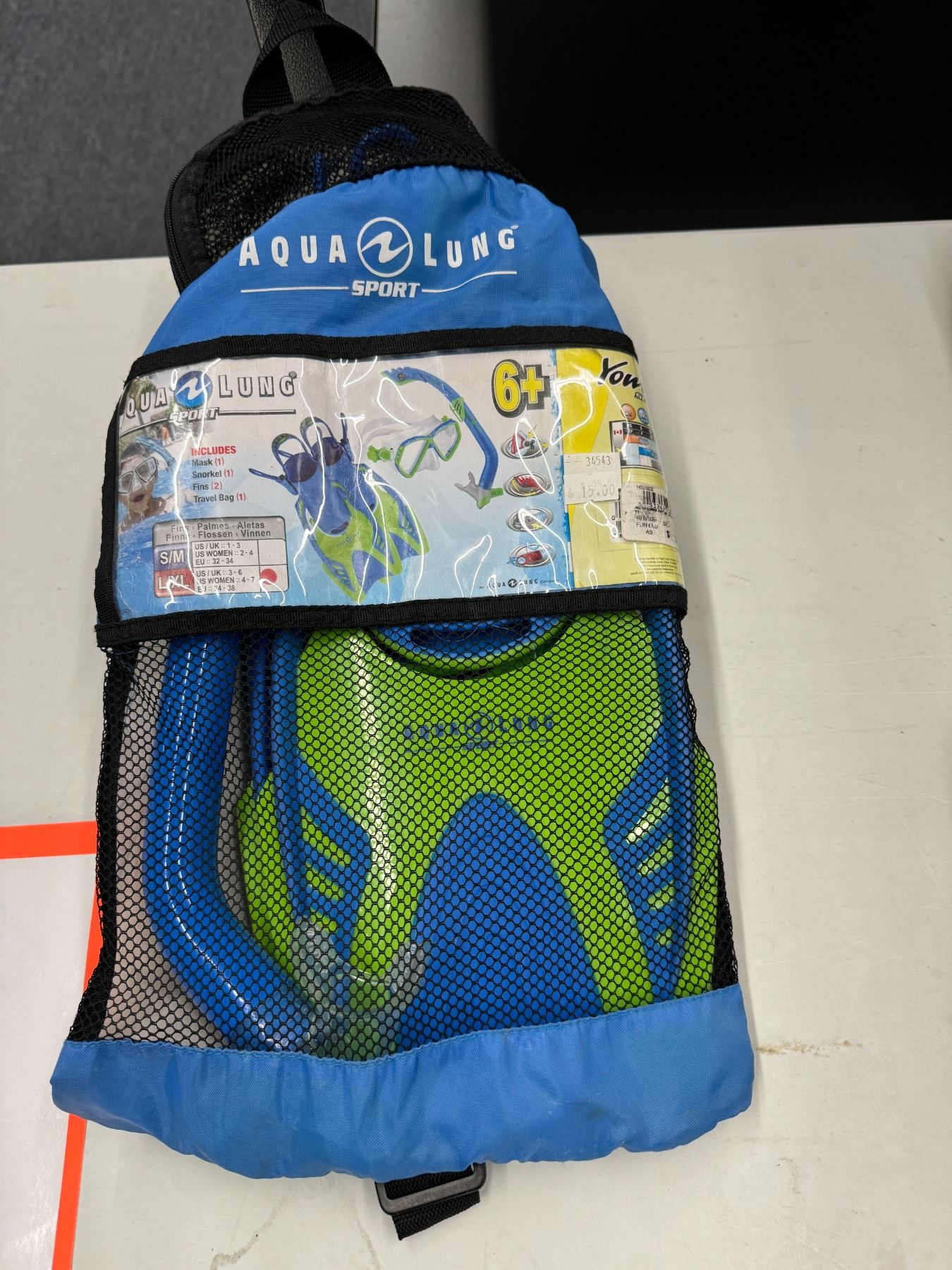Aqualung, masks, snorkel, two fins and bag large/XL