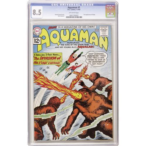 <B>Aquaman #1 (DC, 1962) CGC VF+ 8.5 Off-white pages.</B></I> After 20 years in DC comics, Aquaman had appeared in a mere three solo comics (in <B>Showcase</B></I>) before finally getting his own title here. This issue has the first appearance of Quisp the Water Sprite. Howard Purcell drew the cover, while Nick Cardy, who would gain plenty of experience drawing Aquaman in years to come, handled the interior art. Overstreet 2006 VF 8.0 value = $663; VF/NM 9.0 value = $1,107. CGC census 9/06: 8 in 8.5, 12 higher.<BR><BR><b>Shipping:</b> Slabbed Comic (<a target="_blank" href="http://www.heritageauctions.com/common/shipping.php">view shipping information</a>)