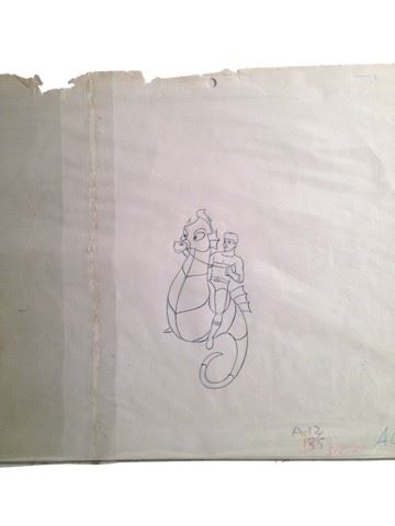 "Aquaman" Animation Cel (featuring "Aqualad" riding his seahorse / includes original hand drawn character sketch / 1974 / Filmation Studios / 12" x 9") (Matted)