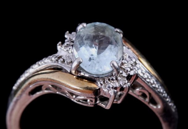The ring features a beautiful Aquamarine stone with Diamonds on either side on a 10k yellow gold and sterling silver ring. The ring is marked both 10k and .925. The ring is a size 6.5.