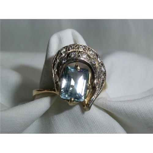 14 kt. gold ring with an aquamarine and 11 small diamonds.