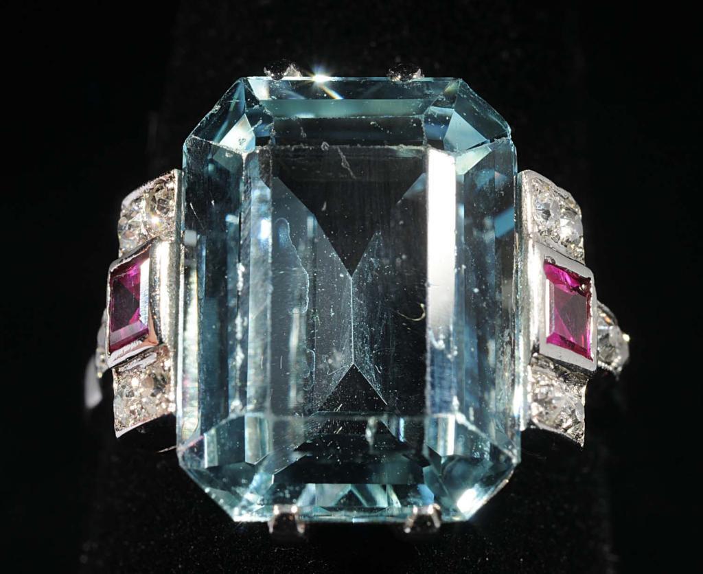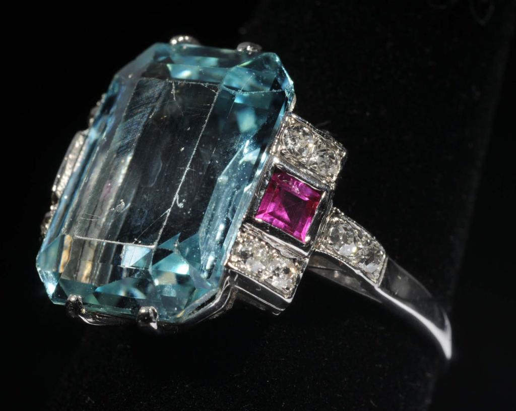 Aquamarine is approximately 12 carats with ten small diamonds and two synthetic rubies. Jewelry Condition (Excellent).