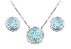 Delightful matching round bezel-set created aquamarine stud earrings and solitaire pendant set makes a perfect gift for someone special. Both the earrings and pendant set are crafted in .925 sterling silver rhodium. These earrings come with push-back and also solitaire pendant with a standard 16 inches sterling silver chain.