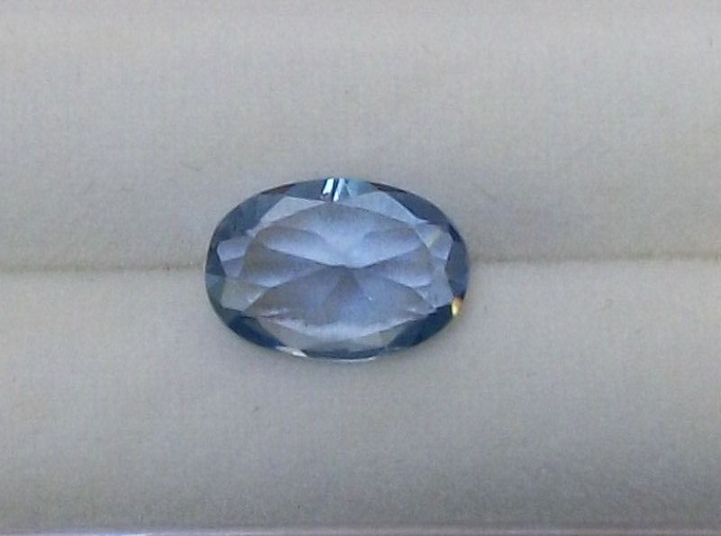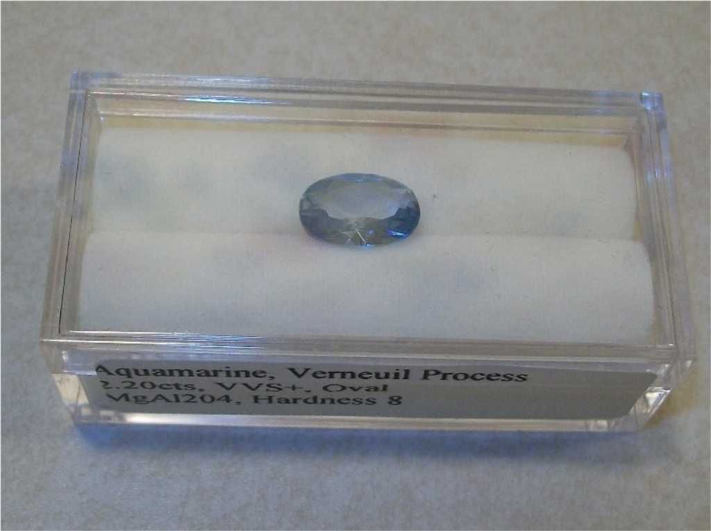 Aquamarine, Verneuil process, 2.20 carats VVS+, oval, MgA1204, hardness 8