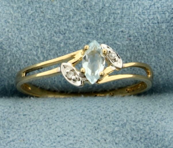 In 10k yellow gold. Containing a high quality .3ct natural aquamarine gemstone with beautiful green blue color and excellent clarity. Also contains two high quality .005ct diamonds. Size 7 1/4 with a 1.5mm band. 1.1g.