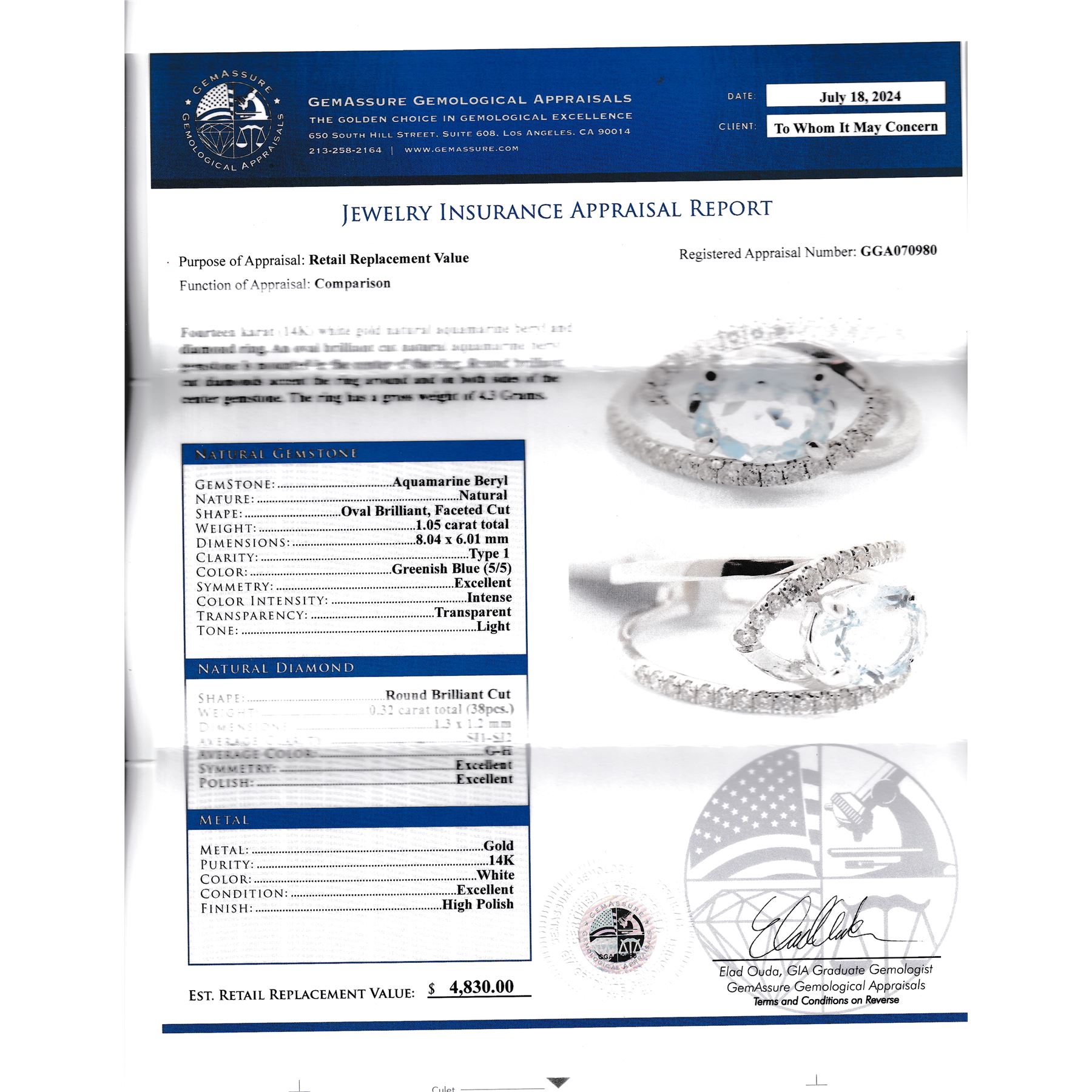 PMI7108-23 / TON TITLE DESCRIPTION: Aquamarine & Diamond Ring DESCRIPTION DETAIL: This gorgeous ring holds an oval shaped Aquamarine surrounded by round brilliant cut natural Diamonds. The Diamonds are pave set in 14k White Gold across the double shank. OVERALL CONDITION: Excellent, New MAIN STONE: Natural Aquamarine (1) Shape: Oval Brilliant, Faceted Cut Approximate Weight: 1.05 Carats Color: Greenish Blue Clarity: Type 1 DIAMONDS: Natural (38) Shape: Round Brilliant Cut Approximate Weight: .32 Carats Total Weight Color: G-H Clarity: SI1-SI2 METAL: 14K White Gold WEIGHT: 4.3 Grams SIZE: 6.5 US APPRAISAL REPORT: GGA certified and appraised this ring with an estimated retail replacement value of $4,830.00. THIS ITEM IS FROM AN ORDERED LIQUIDATION OF A MAJOR JEWELRY MANUFACTURER'S OVERSTOCKED INVENTORY. Please inquire about sizing if needed, and allow an additional 10 days for shipping if we resize it. PRIOR TO BIDDING READ THE DESCRIPTION, TERMS, AND CONDITIONS CAREFULLY This description and condition report is provided for your convenience based on the information provided by the consignor. CAA is not responsible for any discrepancies between this information and other opinions. Buyers Premium: 18% Payment Due in 5 days All items shipped to registered address - NO EXCEPTIONS PMI7108-23 / TON