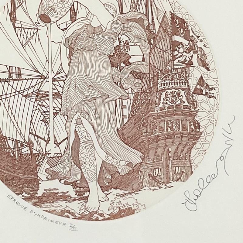 "Aquarius" is a limited edition etching on paper by Guillaume Azoulay, numbered I/II and hand signed by the artist. This piece comes custom framed. Includes Letter of Authenticity. Measures approx. 20.5" x 20.5" (frame), 9" (image-diameter).