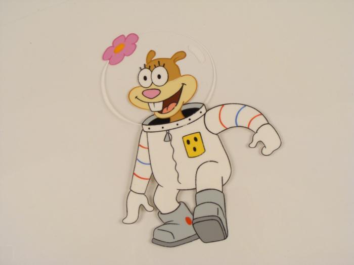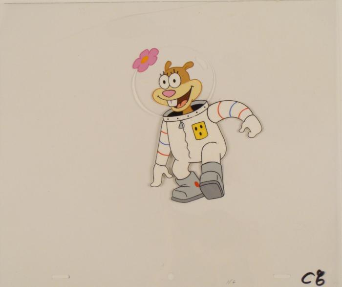 This original animation cel is from the Nickelodeon TV show SpongeBob Squarepants. The story takes place under the deep blue sea in Bikini Bottom, where SpongeBob resides. SpongeBob, who is a yellow, porous sponge, is your typical happy-go-lucky character, as he is always cheerful and enjoys making people laugh. Patrick Star, SpongeBob's neighbor who is a starfish, is your average children's show idiot, as he boasts knowing nothing and is often getting himself into ridiculous situations. Between the homes of these two lies the home of the miserable Squidward, a squid, who is known for being grouchy and playing tricks on SpongeBob and Patrick. Both SpongeBob and Squidward work at the Krusty Krab, a fast food business run by the greedy money-loving Mr. Krabs, a crab, the arch rival of the evil, possibly misunderstood, Plankton. Another neighbor, Sandy Cheeks, an athletic squirrel who normally wears an astronaut's space suit, was introduced in "Tea at the Treedome." She spends most of her time inventing and experimenting. Sandy Cheeks is in her aquatic suit.Original Production Animated Cel Overall Size of Cel: 10 1/2" x 12 1/2" Very Good ConditionThis is an original hand-painted cel set-up used in the production of an episode of "SpongeBob SquarePants." Each one-of-a-kind set-up represents a slight change in position of the characters. When individually photographed and projected in rapid succession, the images appear to move.