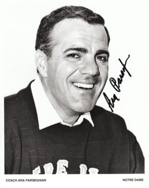 Ara Parseghian served as head coach for three teams, most notably the University of Notre Dame team from 1964–1974. During his 11 seasons as head coach of the Fighting Irish (known popularly as "the Era of Ara"), he compiled a 95–17–4 record, for a .836 winning percentage, making him the most successful Notre Dame coach of the modern era. Ara Parseghian has hand autographed this Notre Dame Fighting Irish 8x10 Photo. Certificate of Authenticity from Athlon Sports. Private Signing July 30th, 2005. Signature has smudge in signature and is sold as is, no returns.
