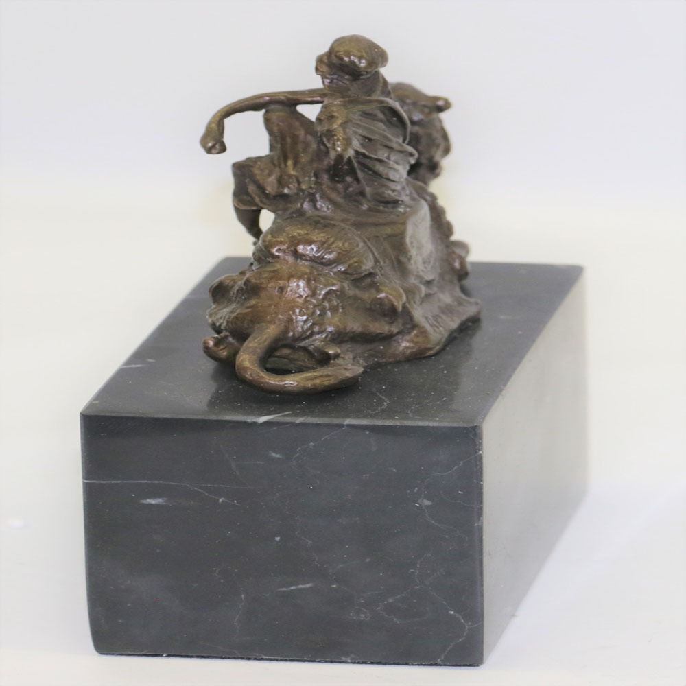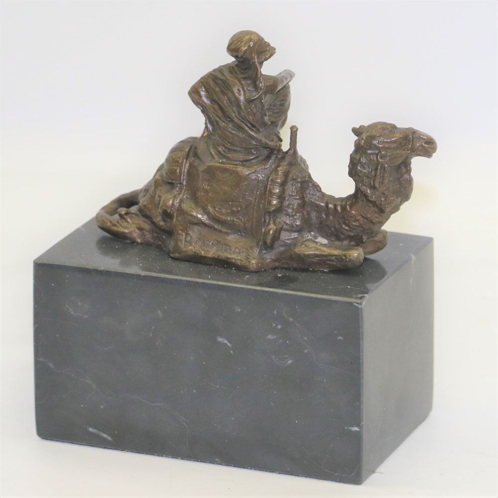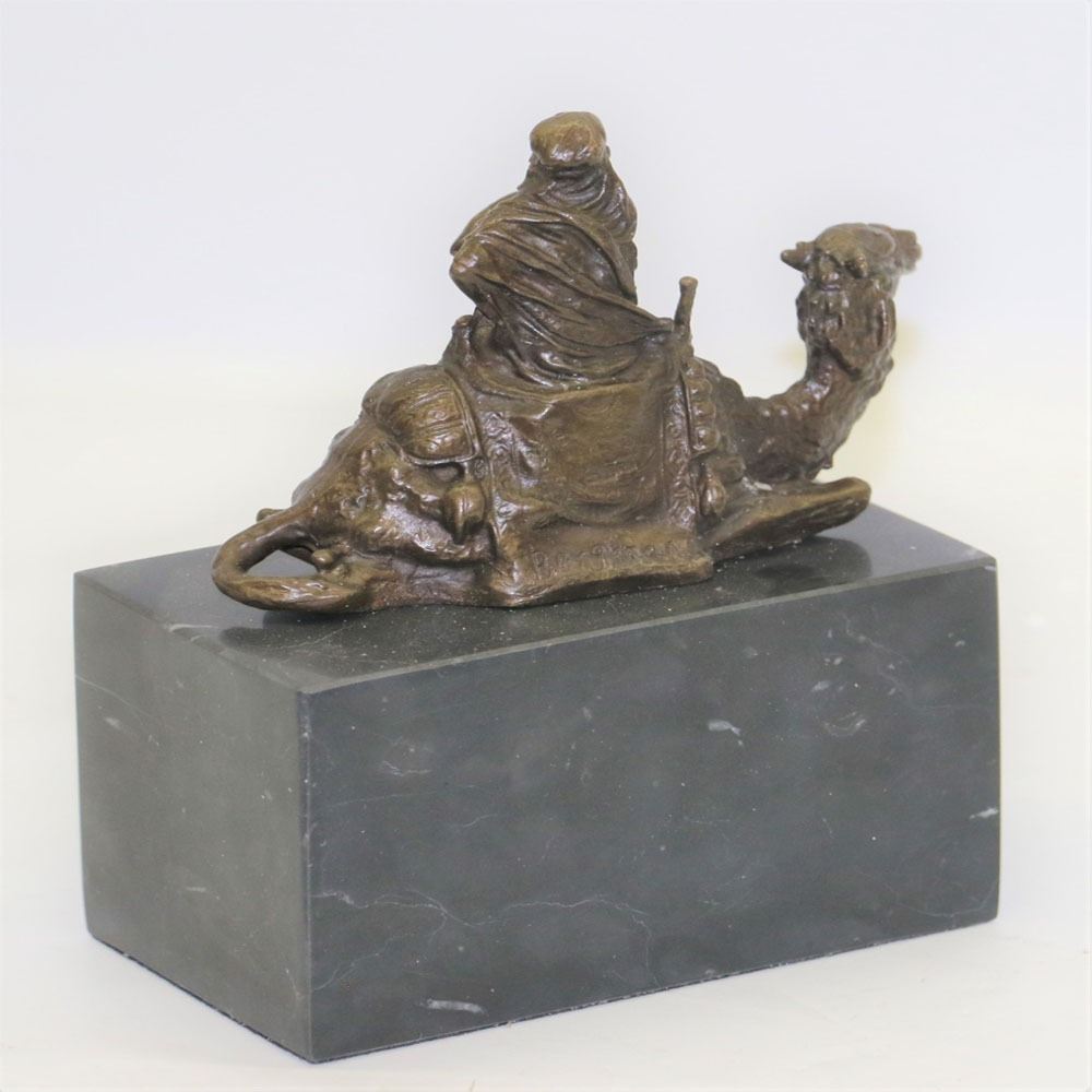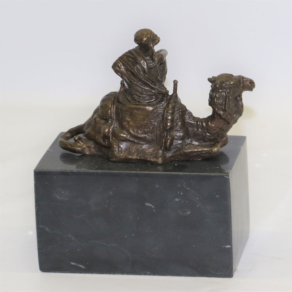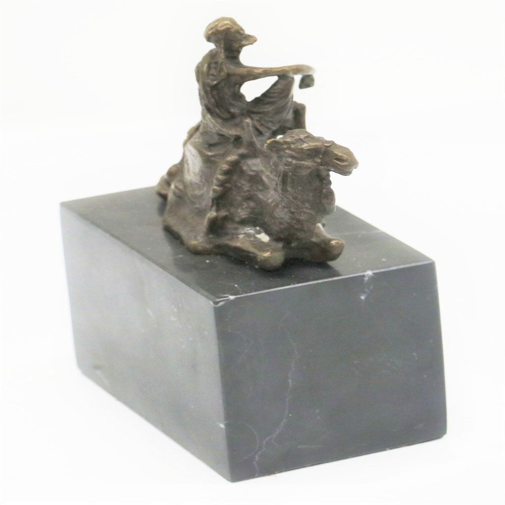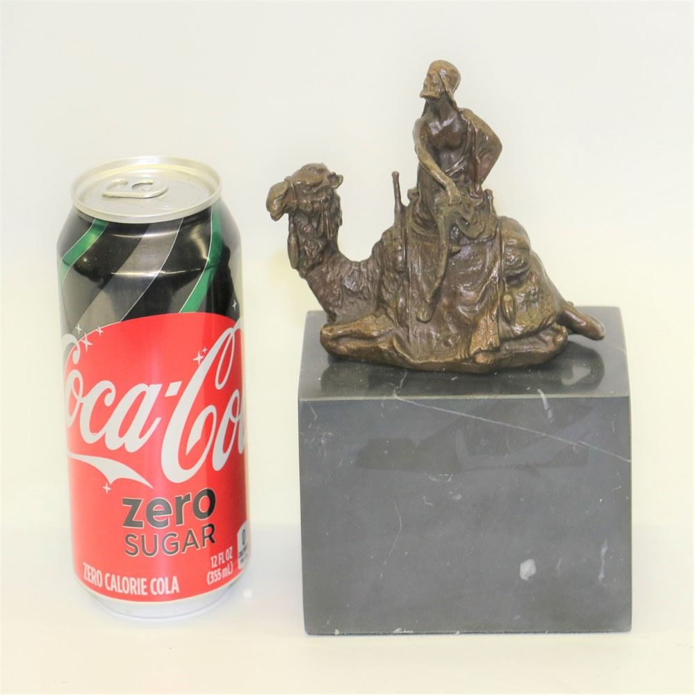 After years of traveling the desert with his faithful camel the two of them are inseparable. The camel does not mind one bit that his owner is perched on top of him as he takes a rest. The camel is saddled up and has an intricate blanket draped over the top of him. His owner sits on top of him and crosses his legs which he rests one of his arms on. He takes off one of his sleeves and lets his body get some fresh air. This bronze sculpture has a lot of minuscule details, so every time you look at the sculpture you will find something new. This bronze sculpture was cast using the Lost Wax Method and has a brown patina and it is mounted on a marble base. Bronze Dimensions with Marble Base: Height 7 X Width 5 inches. Weight: 6 LBS.