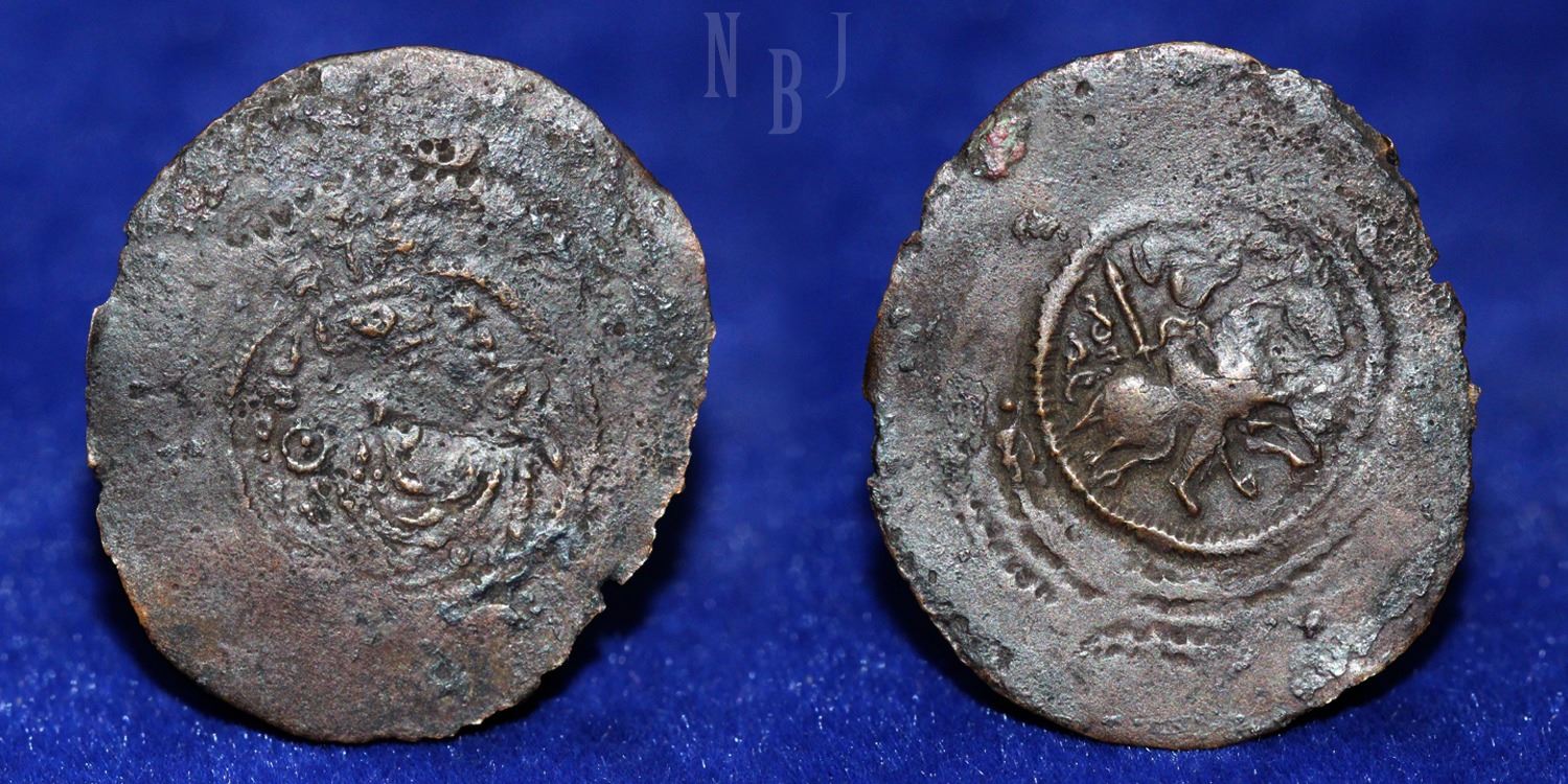 Arab-Sasanian: Umayyad Caliphate. Anonymous. AE Pashiz. Crowned Sasanian-style bust right. Horseman to right, holding Spear, pellets around; double circle border. (1.28gm, 25mm) Fine and Rare.