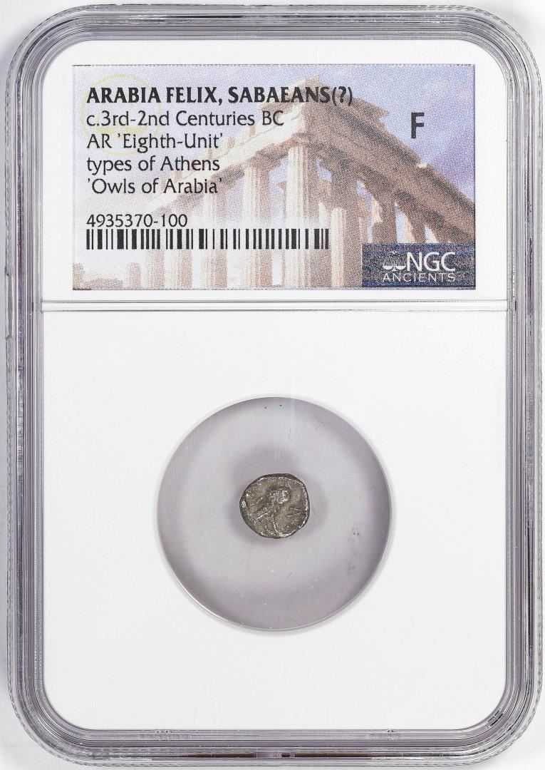 One Arabia Felix, Sabaeans c.3rd-2nd Centuries BC AR Eighth Unit Owl Ancient Coin NGC F. NGC Certified.