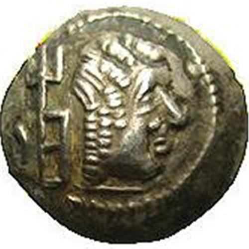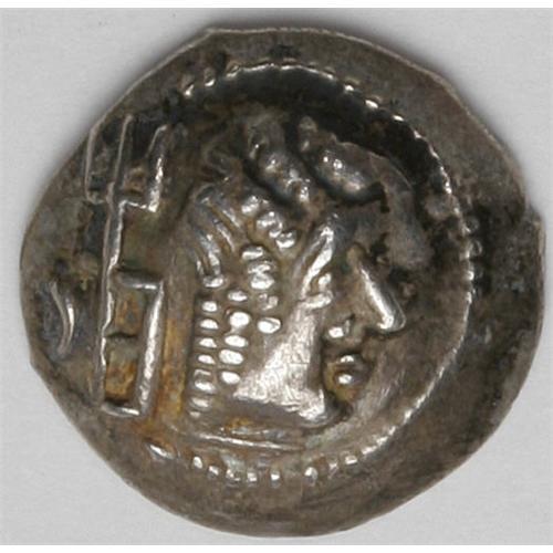 <B>Arabia. Himyarites. Raidan, under 'amdan Bayyin (without Yanaf).</B></I> Ca. A.D. 50-150. AR half denarius (15 mm, 1.19 g). Laureate male head right, surrounded by a pannanular torc / Small male head right. SNG ANS 1595-1601. Toned, good VF.