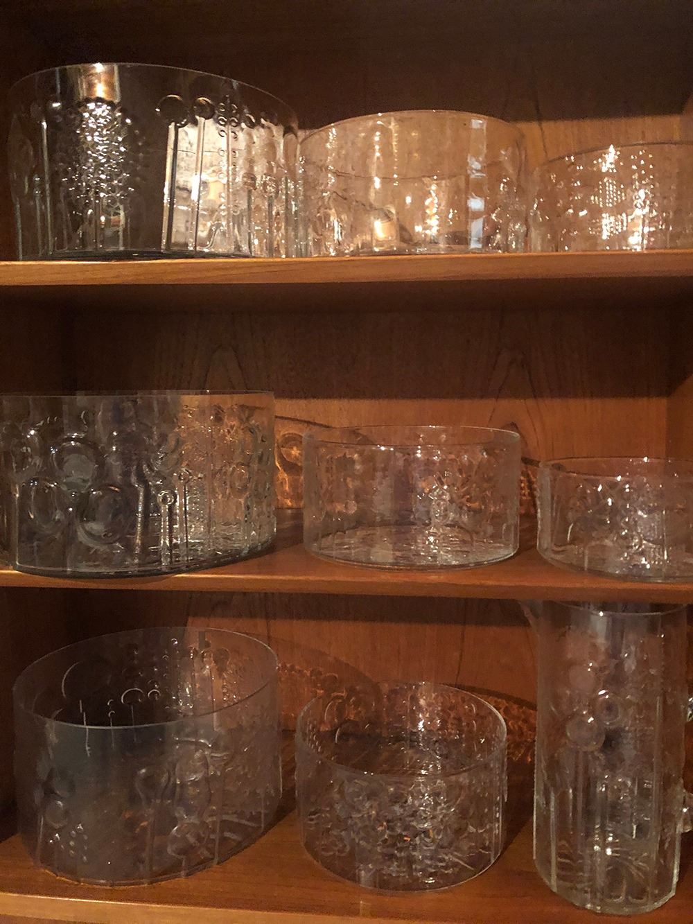 Arabia Iittala, Finland, Flora Pattern, 2 small glass bowls 6 inch x 3 inch, 3 medium glass bowls 7.5 inch x 4 inch, 3 large glass bowls 9.5 x 5.5 and 1 pitcher 9 inch x 4.5 inch wide