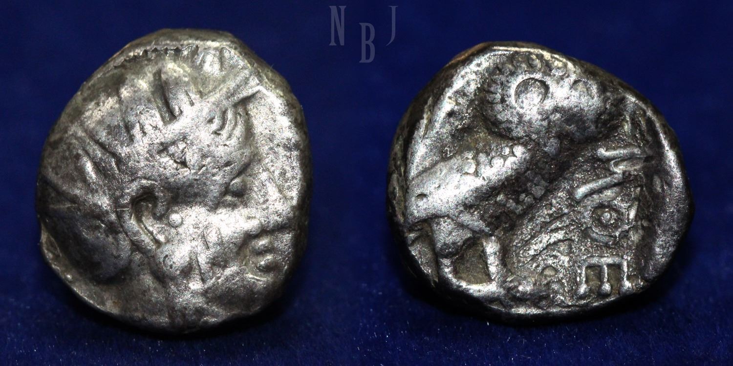 Arabia. Southern. Saba' circa 400-300 BC. Imitating Athens, AR Unit. Head of Athena to right, wearing crested Attic helmet decorated with three olive leaves and palmette; on cheek 𩬠/ ΑΘE, Owl standing right, head facing; to left, olive sprig and crescent. (5.30gm, 16mm) Very Fine.