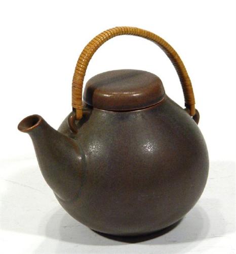 Arabia stoneware teapot and cover with wicker handle decorated in a mottled brown glaze, printed fac