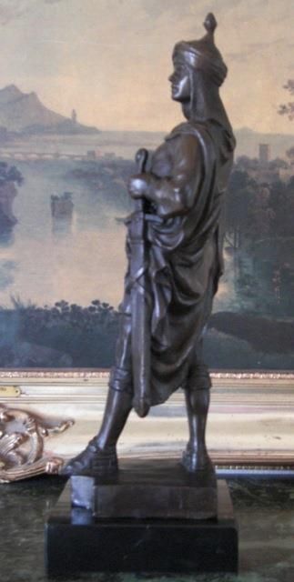 Arabian Knight Bronze Sculpture After Ceviom, 18H x 6 1/2D x 6 1/2W 20 lbs. This bronze sculpture was produced using the "Lost Wax" casting method. The "Lost Wax" Cast method is the most precise metal casting technique in existence, ensuring exquisite detail of the original host model which is usually sculpted in clay or wax. This "Lost Wax" casting method is an extremely labor intensive and expensive process, but the end results produce a Heirloom Quality Masterpiece!