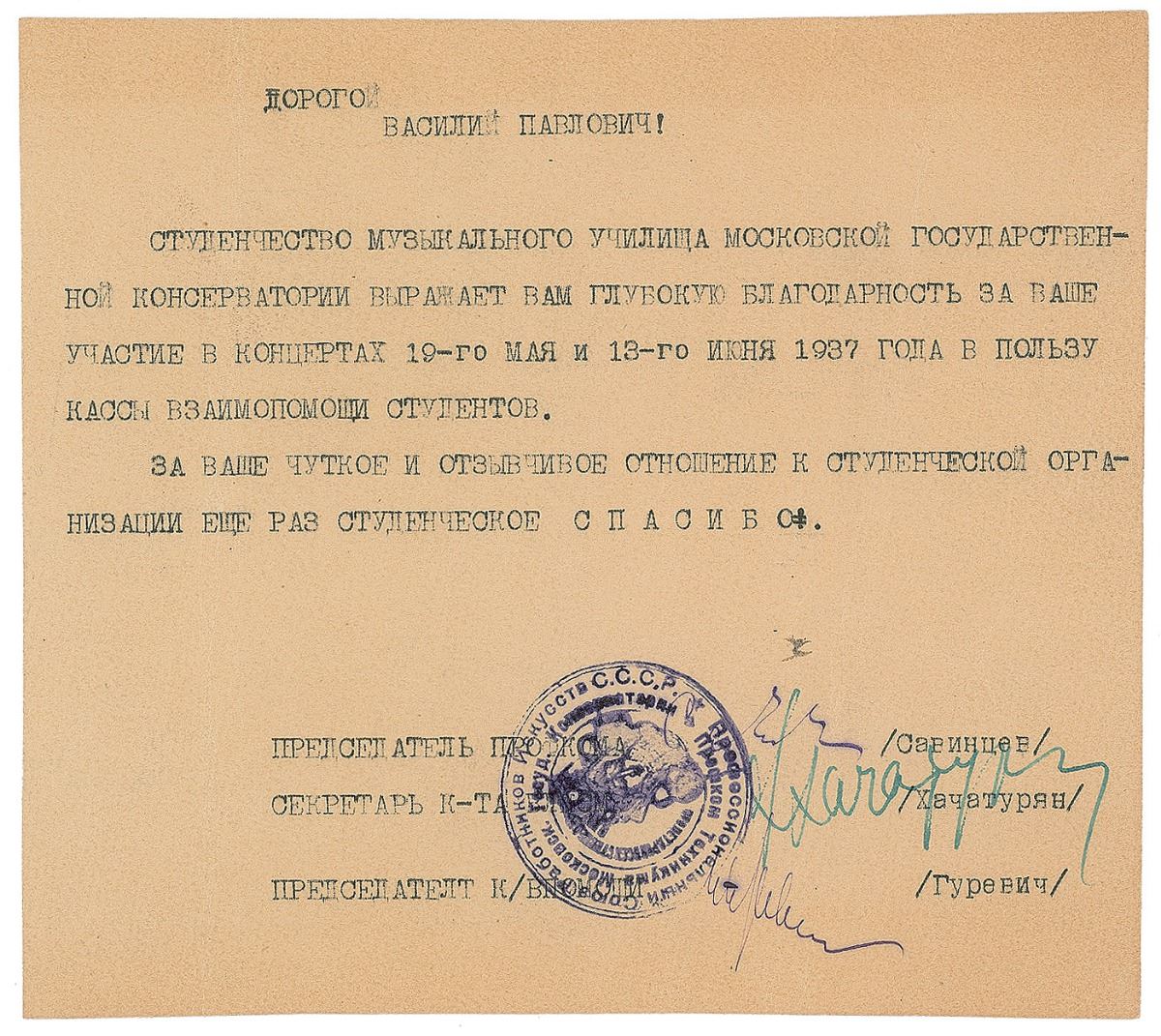 Armenian composer (1903-1978) of the spirited ‘Sabre Dance.’ TLS in Cyrillic, one page, 6.5 x 6, no date. Letter to Vasily Pavlovich of the Moscow Musical College, thanking him for participating in two concerts. In fine condition.
