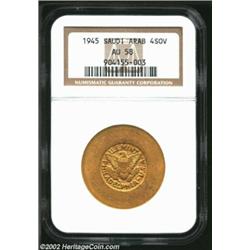 Aramco Gold 4 Sovereigns ND (1945), KM34, AU58 NGC, a bullion issue struck to pay the Saudi government for oil concessions. Important notice: We expect to be auctioning lots at the rate of 200-250 per hour. Sometimes eBay Premier live bid software cannot keep up with that pace, so we strongly recommend that you place a realistic proxy bid now as insurance to avoid disappointment. Also please note that all Heritage/CAA lots purchased through eBay Premier carry a 20% Buyer's Premium. Please make sure you read the Terms and Conditions.
